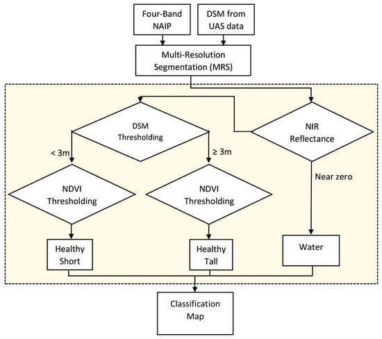 The classification methodology (Figure 4 and Figure 5) used an OBIA approach on pre-fire (NAIP 2014), immediate post-fire (UAS), and post-fire data (NAIP 2016). Both NAIP datasets were orthorectified in a tiled format, with the caveat that each tile may contain up to 10% cloud cover. The 2014 NAIP dataset has a 1 m ground sample distance (GSD), and a horizontal accuracy of ±6 m at a 95% confidence level, whereas the 2016 NAIP dataset has a 0.6 m GSD, with a horizontal accuracy of ±4 m at 95% confidence level. To improve the georeferencing accuracy, the post-correction of the NAIP imagery was performed using ESRI ArcGIS [].