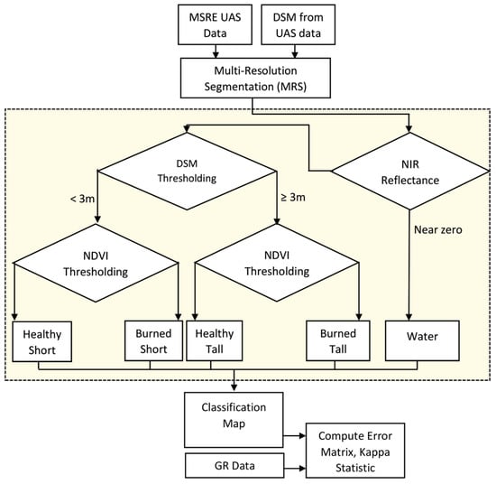 The image objects produced by MRS were then subjected to hierarchical thresholding. The elevation values from the UAS-derived DSM and NDVI were used as features. These features were computed for each object produced by MRS. The histogram of DSM and NDVI values provided threshold estimates. For the healthy tall class, the NDVI thresholds were from 0.49 to 1.0. The other classes are healthy short (0.5–1.0), burned tall (0.2–0.49), and burned short (0.38–0.5). The outputs of thresholding resulted in a set of objects with assigned class labels. Objects with similar labels were combined to form final classification maps.