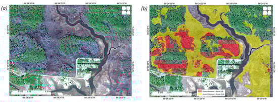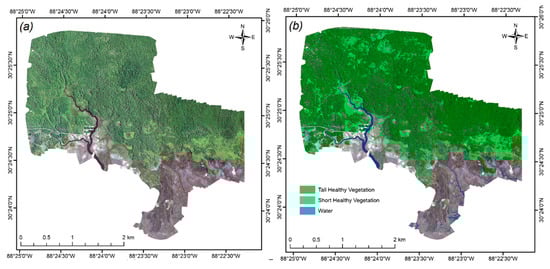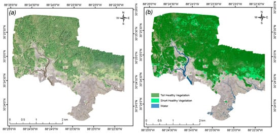 Post-fire NAIP multispectral imagery: (a) A mosaic of the multispectral NAIP imagery (red, green and blue bands are shown) captured over Grand Bay National Estuarine Research Reserve/National Wildlife Refuge in June 2016 and (b) classification map produced by hierarchical object-based image analysis showing the extent of healthy vegetation.
