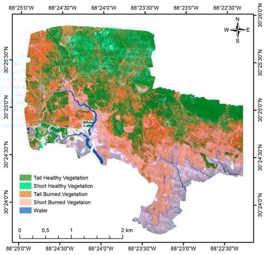 To assess the regeneration of vegetation in the study area, NAIP multispectral data were utilized along with the UAS-collected imagery. For pre-and post-fire NAIP data, the classes considered were water, healthy tall, and healthy short vegetation. The classification process considered vegetation taller than 3 m as tall (trees) and vegetation shorter than 3 m as short (marshes). The classes considered for the UAS image classification were healthy tall and short vegetation, burned tall and short vegetation, and water.