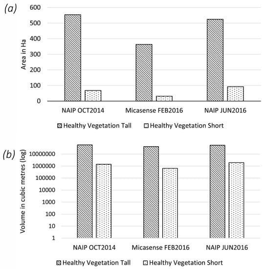 Classified regions were exported from eCognition as georeferenced rasters with the same resolution as the original UAS or NAIP data. Classified regions were also exported as shapefiles in order to calculate the area and volume of different classes in ESRI ArcGIS. The areas of healthy vegetation classes were computed using the ‘Zonal Statistics’ tool in ArcGIS. The volume computed was the product of the previously calculated area and the UAS-derived DSM. Since corresponding elevation values were not available for the NAIP imagery, UAS-derived DSM values were used as a proxy.