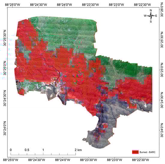 The OA of the UAS classification map was improved by considering water as a separate class. The BARC map considered water as burned in some regions (Figure 13b, label P6). A mixed pixel similar to that of a burned region can be produced in the BARC map due to water absorption of most or all NIR light, near-water vegetation spectral responses, and the coarse GSD of the satellite imagery. Given the above caveats, the UAS classification map produced a more accurate burned area estimation in these regions than the BARC map.