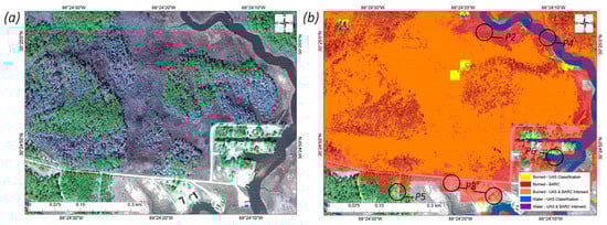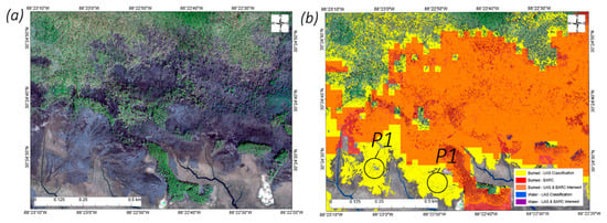 Alternately, other regions of the BARC map show a greater extent of the burned area than the UAS classification map (Figure 13) due to spectral similarities of some unburned regions with that of burned areas. False positives can be due to low-lying marshes (Figure 13b, label P2), human-made objects (Figure 13b, label P3), and water (Figure 13b, label P4) that may show responses in the NIR and SWIR bands that may appear similar to some burned areas. Ground observation verified these areas (Figure 13b, labels P2–P4) to be unburned regions.