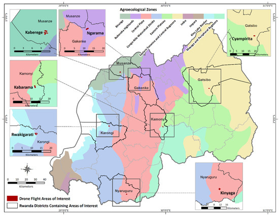 Map of Rwanda with district boundaries (black), UAV flight sites (solid red polygons within zoomed area), and agroecological zones (various colors).