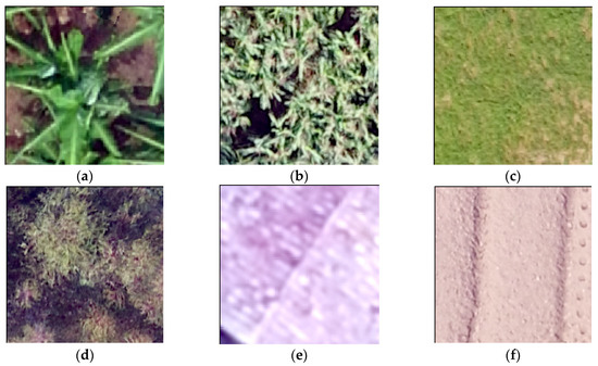 Example images of the six classes used for training and validating the CNNs; (a) Banana, (b) Maize, (c) Legume, (d) Forest, (e) Structure, and (f) Other.