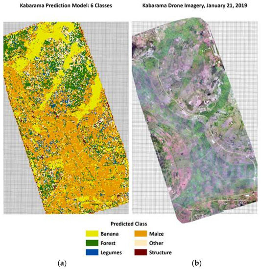 Comparison of (a) predicted crop classifications for the Kabarama site and (b) the stitched drone imagery for the Kabarama site.