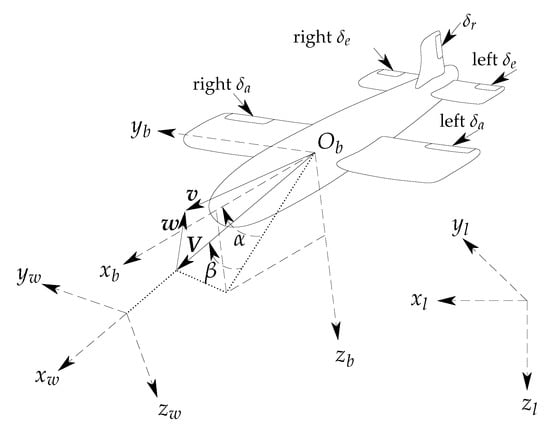 The dynamic model for a particular vehicle, a fixed-wing UAV for example, describes how and are specified following an aerodynamic model. This model takes motion states, wind velocity, actuators, and physical parameters of the platform as inputs. The models vary for different UAV types. A fixed-wing platform is considered here, as described in [3]. As depicted schematically in Figure 1, this UAV has a single propeller, with aileron, elevator, and rudder control surfaces. The models for aerodynamic forces and moments for this UAV are borrowed from [8].