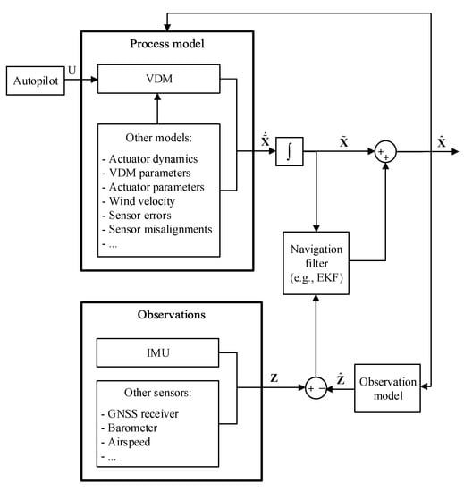 The VDM needs to be fed with actuator states. If internal dynamics of the actuators is ignored, actuator states will be equivalent to the control input (). Otherwise, the control input is fed to associated models for actuator dynamics, which provide actuator states to the VDM. The parameters of actuator dynamics model may also be part of the augmented state that is estimated within the filter. Another needed input for the VDM is the wind velocity (, “Other models” block, not shown in Figure 2), which is estimated within the navigation system with or without the aid of airspeed sensor(s). Reliable airspeed data is expected to improve the redundancy and possibly the accuracy of wind estimation.
