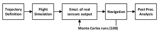 At this stage, the software possesses all of the information to simulate the behavior of a platform following a defined trajectory and, most importantly, the sensors and actuator outputs at each discrete step. The ideal sensors readings (accelerometers, gyroscopes) are first corrupted with errors such as random bias, 1st order Gauss–Markov process and white noise. The considered error characteristics are summarized in Table 2. Their values correspond to a small MEMS-IMU [13] that was employed in an experimental scenario [5] with noise characteristics analyzed in [14]. The considered GNSS observations corresponds to single-point-positioning.