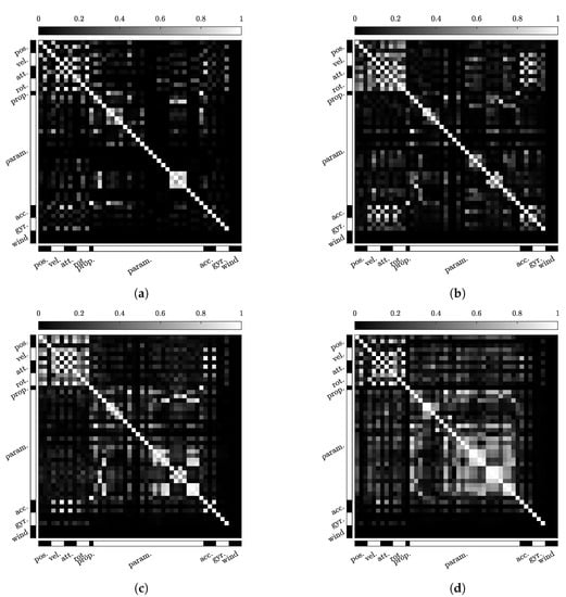 Normalized correlation matrix P between state-vector elements at the end of a maneuver: (a)—Level flight, (b)—Controlled Orbit (c)—Infinity loop, (d)—Combination of segments