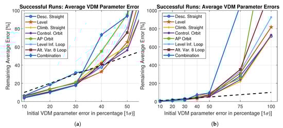 The remaining average VDM parameter error at the end of accumulated successful runs for different trajectories are depicted in Figure 5 and the filter divergence based on successful runs can be observed as a function of initial errors.