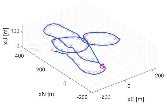 The waypoints are considered to be reached (cleared) when the platform is within a radius of 15 m, then the next waypoint is activated. The guidance dictates the action of actuators to be taken directing the plane to the next waypoint. The controller generates the actuator states (i.e, the elevator, aileron and ruder angles, and propeller speed) and together with ideal VDM parameters, they define the nominal forces and moments following the model described in Section 1. The ideal-reference trajectory follows from rigid-body motion. Simultaneously, the ideal sensors output is generated at a desired frequency, i.e., in Equations (16) and (17) for the IMU and from the derived states as presented in Equation (3) for GNSS. parentheses The ideal trajectory is saved as a reference, whereas the generated sensors and actuator commands are used in the following step. The generated control commands are delay-free, implying the absence of time stamping errors in the data or delay of actuators when reaching the desired state. The influence of time-delay errors has been investigated in [12].
