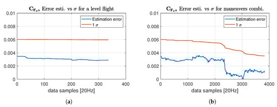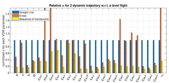 The system is not completely observable at any time t. This is an unambiguous interpretation of the covariance matrix at the end of the level trajectory (Figure 4a). The lack of correlation among groups of coefficient reveals the lack of observability in the system for the considered case. Nevertheless, from Figure 8, we witness a relative reduction of the VDM parameter errors as the dynamic of the trajectory increases. This, in turn, suggests that the VDM parameters become observable (or their sub-groups) over a certain time interval with sufficient dynamic. This is equally applicable to the uncertainty reduction (standard deviation, ), as observed in Figure 7 for the coefficient . Here, the time influence is perceptible and the same tendency is pertinent to all coefficients.