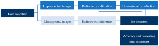 The SEI (Spectral Evidence of Ice) project [13,14] proposes to provide an integrated solution that can handle the automatic pre-deicing inspection, ice detection, and cleaning verification procedure. The expert crew manages the request of de-icing and sends the UAV to the parking area (or hangar) of a specific aircraft that needs the procedure. The UAV can autonomously recognize the location of the aircraft and starts the inspection. Indeed, the multi-sensor UAV platform, equipped with a hyperspectral or multispectral camera, has been designed to monitor and inspect aircraft in the specific de-icing area of the airport. The main task of the drone is the identification of the location and the extension of the ice-contaminated area. For this purpose, an automatic methodology for geometric and radiometric detection of the ice has been determined. The development of computer-oriented methods for ice detection is still challenging due to the physical characteristics of the ice, variable atmospheric condition, and lack of autonomous technology in this application field.
