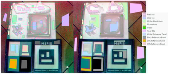 The two datasets of images were radiometrically calibrated using the Empirical Line Calibration tool of ENVI 4.7 [47]. Then, the images of each sensor were manually annotated. In both cases, the same 10 classes were considered: rime ice, clear ice, white aluminum, aluminum, floor tile, wood and reference panel (white, black, grey 21%, and grey 27%). The representative classes were only the rime ice, the clear ice, and the white aluminum (Figure 3). These classes were chosen according to the materials that it was possible to distinguish in the real case at aircraft scale. The selected materials were related to the object (in our case, the aircraft) and the ice. Other materials were included in the background in different classes to improve the performance of the classification. The option of a single class for background materials would alter the accuracy of outcomes. The number of samples per class for each dataset are reported in Table 2.