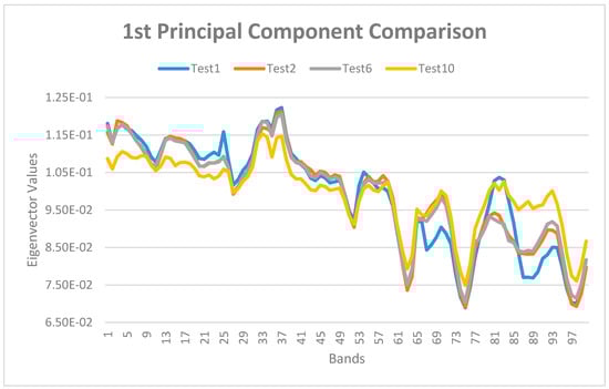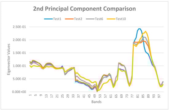 As it is possible to notice in Table 4, there are recurring bands in each test. Taking into account all the identified bands, a new hypercube with 27 bands, that are 1 (506.31 nm), 3–7 (from 514.48 to 530.11 nm), 14 (558.28 nm), 25 (602.47), 32–38 (from 630.2 to 654.19 nm), 78–89 (from 817.58 to 861.65 nm) can be generated. However, considering only the popular bands in each principal component of all images, the number of significative bands can be further reduced to 10. The significative bands, in this latter case, are 4–5 (from 518.12 to 522.48 nm), 33–37 (from 634.36 to 650.38 nm), 83–85 (from 837.98 to 846.21 nm).