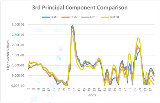 After the identification of the PC number, the first three principal components were used to select a reduced number of original bands for the classification task. The band selection process was carried out using the eigenvectors for each PC. The higher the absolute value of the band eigenvector, the higher the importance of that band for the specific principal component. According to this criterium, considering that the number of significative bands is strictly related to the application, a threshold of eigenvector values, defined for each component, allows to identify the significative bands. The plot of eigenvector values reports the correlation between spikes of the function and the representative bands. Figure 5, Figure 6 and Figure 7 represent the eigenvector values with respect to the band number for the three selected principal components in four representative images (Test1, Test2, Test6, Test10) among 10 hyperspectral images. Different illuminations and the change of the state of ice characterize these four tests, and this comparison was made to check the recurrence of the most significant bands, that can be selected. The presence of spikes in the eigenvectors function allows to recognize the bands, for all the images for the three selected PCs (Table 4):