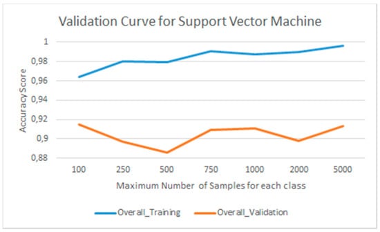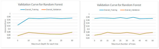 The optimized hyperparameters were chosen according to two criteria. The first one is the minimum difference between the overall accuracy of training and validation models, and the second one is the best user’s accuracy only for the validation. It is necessary to notice that for the evaluation of the accuracy the random choice of the samples has to be taken into account; thus, tolerance has to be considered. Accuracy analysis of training and validation are presented for both the algorithms.