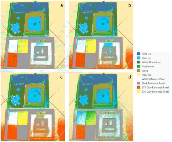 Figure 11 highlights the results of the classification in the two datasets using the SVM. The improvement related to the introduction of the additional band is evident. The blue band allows to reduce the classification noise and at the same time a better identification of all materials. Moreover, the enhancement of the distinction between rime ice or clear ice and white aluminum is clear.