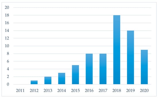 The 68 identified publications [,,,,,,,,,,,,,,,,,,,,,,,,,,,,,,,,,,,,,,,,,,,,,,,,,,,,,,,,,,,,,,,,,,,] related to UAS-based archaeological remote sensing, were published between 2012 and 18 June 2020 in 36 different publications/journals. Collectively the International Society of Photogrammetry and Remote Sensing has published 9 articles (~13.2% of the total number of analyzed publications), under the International Archives of the Photogrammetry, Remote Sensing and Spatial Information Sciences, ISPRS Annals of Photogrammetry, Remote Sensing and Spatial Information Sciences, and ISPRS International Journal of Geo-Information. The WILEY journal Archaeological Prospection published the largest number of articles (8), while Elsevier’s Journal of Archaeological Science: Reports published 5 and MDPI’s Remote Sensing published 4. The trend in publication had increased each year steadily, until 2018, with the maximum growth in the number of articles published observed between 2017 and 2018 (Figure 1). Citation information derived from Google Scholar shows that the average number of times each publication has been cited is 9.2, with a minimum of 0, a maximum of 84 ([] published in Journal of Archaeological Science), and a median of 3. Archaeological prospection related applications accounted for ~77% of the documented studies, while much smaller numbers were observed for the other types of applications, ~23% for historical terrain visualization, ~13% for archaeogeography, and ~6% for site monitoring applications (Figure 2). Nevertheless, the studies included in the meta-analysis covered a wide range of archaeological contexts and, broad geographic extent.