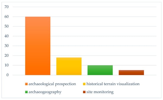 The studies were classified into four categories that correspond to representative archaeological remote-sensing fields. The categories are: “archaeological prospection” for studies aimed at the detection of buried archaeological remains either by direct sensing of their properties, or by measuring the contrast within their immediate landscape matrix (number = 60); “historical terrain visualization” for applications related to digitally enhancing the visibility of observable above ground archaeological features such as previously unburied remains, earthworks or geoglyphs, and of their immediate surroundings (number = 18); “archaeogeography” for studies directed towards analyzing the detected archaeological features—beyond plain visualization—by defining their geospatial relations (number = 7); “site monitoring” for those investigations aimed at monitoring historical landscapes and uncovering their natural or human-induced historical transformations through time (number = 4). For a few cases, an overlap was observed (number = 15), meaning simultaneous use of the same UAS-based equipment for more than one archaeological purpose, with different platform configurations, or by exploiting multiple data-processing scenarios.