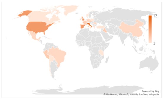 Study locations were mapped from the 68 publications, and it was found that UAS have been employed in applied archaeological remote sensing across the world with primary clusters of activity in Europe and North America (Figure 3). A secondary cluster was observed around the tropical countries of Central and South America where dense canopy is obscuring the rich archaeological landscapes and, therefore, increasingly more studies are taking place to reveal and to visualize the hidden historical terrains. Italy leads the ranking of countries where UAS-based archaeological studies have taken place (12), followed by Spain (7), the United States of America (7), Czech Republic (6), the United Kingdom (6), and Greece (4).
