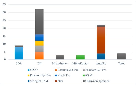 The majority of studies (60) reported using multirotor-style platforms, which can be attributed to easier maneuverability, higher stability, and the capacity to carry heavier payloads with smaller platform size-to-payload ratios. Only 27 studies reported the use of fixed-wing platforms. In total, 91 platforms were involved in the studies, of which 27 were fixed-wing, 42 quadcopters, 12 hexacopters, and 14 octocopters (circle-shaped, v-shaped, and X8 rotor configurations). The most commonly used platform (Figure 4) was the senseFly eBee, a fixed-wing platform which can be purchased around $25,000 USD with real-time kinematic (RTK) positioning enabled and a SODA 20 MP RGB camera, has a maximum flight time of 50 m, 33 km flight range and optional multi-spectral and thermal sensors available. Other popular choices included the DJI Phantoms and the (discontinued) 3DR SOLO. A few studies reported the use of a custom made platform.