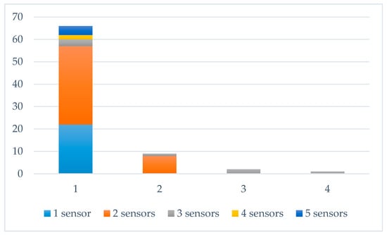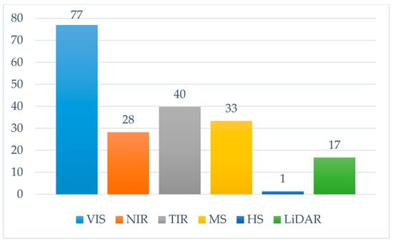 Significantly, 56 studies reported the utilization of multiple sensors, and 12 studies also reported employing multiple platforms (Figure 5). Ten studies used LiDAR sensors, 22 studies used near-infrared (NIR) cameras, 31 studies used thermal-infrared (TIR) cameras, 26 used multi-spectral cameras (MS), and a single study used a hyperspectral (HS) camera (Figure 6). Studies overwhelmingly used pre-equipped or off-the-shelf red, green and blue (RGB) cameras (77%), mainly in combination with other sensors. Canon cameras were a popular choice (used for 31% of the total studies), as 17 studies used Canon off-the-self cameras for RGB acquisition, while 16 studies used Canon cameras for NIR acquisition after they were subjected to a modification in order to be sensitive only in a portion of the NIR spectrum.
