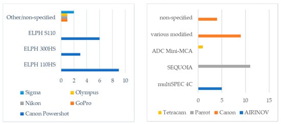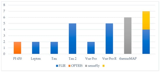 All reported NIR data acquisitions were performed with commercial digital cameras (digital-single-reflex, compact, and action cameras), modified by either the manufacturer of the UAS platform or the researchers. Canon PowerShot ELPH 110HS, PowerShot ELPH 300HS, and PowerShot ELPH S110 were the most frequently used cameras modified for NIR imaging (Figure 7–left). The most recurrently used MS camera was the Parrot Sequoia (11 studies), whereas modified Canon cameras were used in 9 studies, the AIRINOV Multispec4C was used in 5 studies, and the Tetracam ADC Mini-MCA and the MAPIR Survey2 cameras were each reportedly used once (Figure 7–right). Regarding TIR sensors, 16 FLIR-manufactured cameras purposed for UAS integration were reported, but the senseFly thermoMAP was the most popular thermo-camera solution (Figure 8). Most studies captured imagery with nadir—or near nadir—facing cameras; only a handful of studies stated they captured oblique imagery.