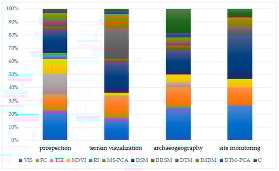 Relative percentages of data products used per application category (VIS—visible orthophoto map; FC—false-color orthophoto map; TIR—thermal infrared orthophoto map; NDVI—normalized difference vegetation index; RI—multiple vegetation and soil reflectance indices; MS-PCA—principal component analysis of multi-spectral imagery products; DSM—digital surface model; DDSM—differential digital surface model; DTM—digital terrain model; IMDM—interpretative mapping of digital models; DTM-PCA—principal component analysis of digital terrain model; C—classification of images, rectified images or ortho-mosaics).