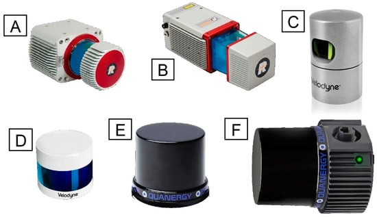 Examples of LiDAR sensors for UAS: (A) RIEGL VUX-1UAV; (B) RIEGL miniVUX-2UAV; (C) Velodyne HDL-32E; (D) Velodyne Puck 32MR; (E) Quanergy M8-Core; (F) Quanergy M8-PoE+.