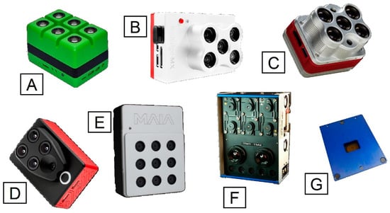 Examples of multi-spectral cameras for UAS: (A) Buzzard Six Band; (B) MicaSense RedEdge-MX; (C) MicaSense Altum; (D) Parrot Sequoia+; (E) SAL MAIA WV; (F) Tetracam MCAW; (G) Tetracam ADC-Micro.