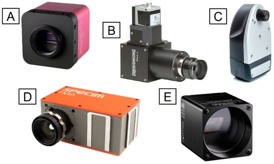 Examples of hyperspectral cameras for UAS: (A) Photonfocus MV1-D2048x1088-HS05-G2; (B) RESONON Pika L; (C) SENOP HSC-2; (D) SPECIM FX10; (E) XIMEA xiSpec Series.