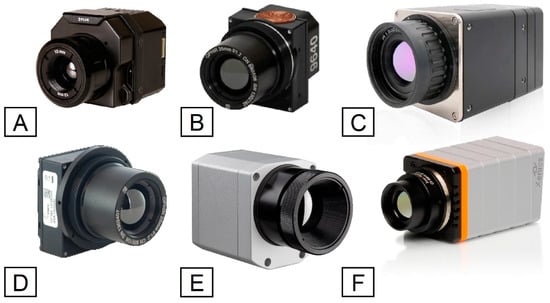 Examples of thermal cameras for UAS: (A) FLIR Vue Pro R; (B) ICI 9640 P-Series; (C) VarioCAM HDx head S; (D) Leonardo DRS TAMARISK Precision; (E) Optris PI 640; (F) Xenics Gobi 640-Series.