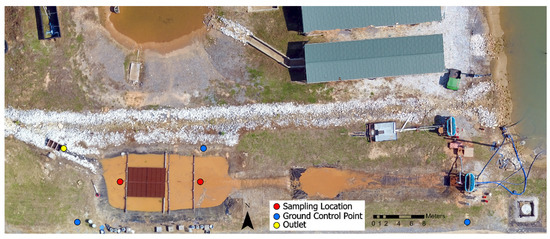 Map of the Auburn University Erosion and Sediment Control Testing Facility sediment basin where the experiment was conducted. The sampling locations, ground control points for spatially referencing the drone flights and the outlet of the sediment basin are shown.