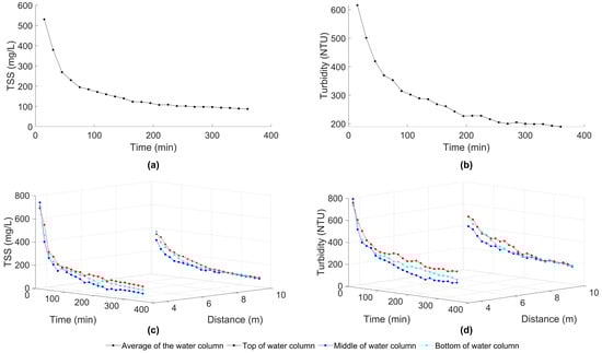 Turbidity and TSS results show the settling of particles over the six-h time period and also throughout the water column (Figure 2). The TSS results (Figure 2a) showed a slightly more rapid decline at the beginning and flatten out towards the end compared to turbidity (Figure 2b). This can also be seen in the graphs showing space and time (Figure 2c,d). The first few measurements in the water column closest to the inlet were similar, but rapidly diverge, indicating settlement over time. The first measurement in the water column furthest from the inlet was much lower than the initial measurement in the first water column. This is due to larger solids settling quickly upon entry into the basin, resulting in higher measurements near the front of the basin. The water column was more uniform near the outlet, demonstrating that TSS and turbidity reached equilibrium towards the rear of the sediment basin.