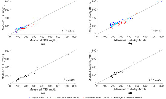 Scatter plots of measured TSS and turbidity compared to modeled results: (a) all TSS values and modeled TSS values, (b) all turbidity values and modeled turbidity values, (c) averaged water column TSS values and modeled averaged water column TSS values, (d) averaged water column turbidity values and modeled averaged water column turbidity values.
