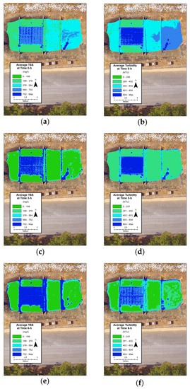 Generated sUAS average TSS and turbidity maps (blue rectangle is the lamella plate settler): (a) average TSS map at time equals 0 h, (b) average turbidity map at time equals 0 h, (c) average TSS map at time equals 3 h, (d) average turbidity map at time equals 3 h, (e) average TSS map at time equals 6 h, (f) average turbidity map at time equals 6 h.