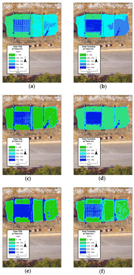 Generated sUAS total TSS and turbidity maps (blue rectangle is the lamella plate settler): (a) total TSS map at time equals 0 h, (b) total turbidity map at time equals 0 h, (c) total TSS map at time equals 3 h, (d) total turbidity map at time equals 3 h, (e) total TSS map at time equals 6 h, (f) total turbidity map at time equals 6 h.