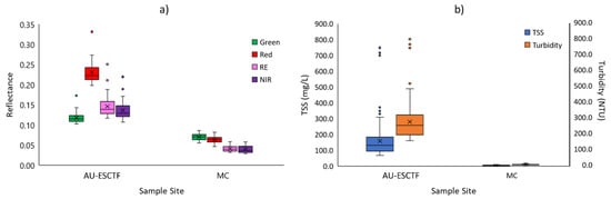 Comparison of results to Prior et al. [32]: (a) box and whisker plots of reflectance values from this study (AU-ESCTF) and from Prior et al. [32] sampling at Moores Creek, Lanett, AL, USA (MC), (b) box and whisker plots of TSS and turbidity from this study (AUESCTF) and from Prior et al. [32] sampling at Moores Creek, Lanett, AL, USA (MC).
