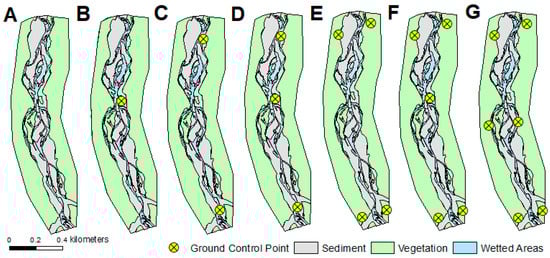 Seven different scenarios tested with varying numbers and configurations of Ground Control Points (A–G), overlain on simplified reach map.