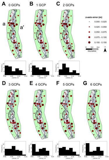 Z-axis absolute errors for scenarios with GCPs ranged from 0.00 to 0.14 m (Figure 3), with all histograms showing a positive skew. The histogram for 0 GCPs (Figure 3A), shows a bimodal distribution which is a result of an area where there were consistently higher errors (area a-a’, Figure 3A). This bimodality is also observed in some of the other scenarios which show a larger range in spatial errors but is most distinct for scenarios with 0, 2, 4 and 6 GCPs. This area (a-a’) of higher errors is also observed when less than three GCPs were used. This spatial clustering of errors is less obvious for scenarios with 3 and 5 GCPs but was still present for the 4 and 6 GCPs scenarios.