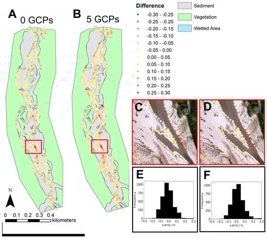 Spatial distribution of z-axis errors (m) for 3300 validation RTK-GNSS water edge check points, compared with digital surface models for the 0 (A) and 5 (B) GCP scenarios; (C) 0 GCPs and (D) 5 GCPs show an enlarged area of high positive errors where the water edge check points are positioned on a steep channel bank; (E,F) show histograms for the 0 and 5 GCP scenarios, respectively.