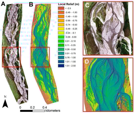 Orthoimage (A) and Digital Surface Model, DSM; (B) of the reach, for scenario A (0 GCPs). The DSM has been detrended of longitudinal slope (see McKean et al., [61] for methodological explanation of detrending) to show local relief, resulting in positive and negative elevation differences relative to the local topography only, and output at a resolution of 0.5 m for illustrative purposes (ground sampling distance of the original product was 22.7 mm); (C,D) show a diffluence–confluence unit in the main braidplain to highlight detail in the orthoimage and DSM.