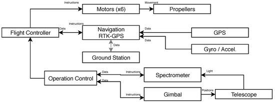 A Pixhawk flight controller is used to handle and manage aerial dynamics, and also to gather every sensor output in the device. The controller comes with integrated gyroscopes, magnetometers and barometers. The only external sensor that needs to be adapted and purchased separately is the navigation (GPS) unit. The Pixhawk supports Real Time Kinematic GPS (RTK-GPS), a combination of inertial sensors and satellite navigational data that can grant the UAV a positioning precision under 20 cm [27,28]. The flight controller is in permanent communication with the operation controller, which is a Raspberry Pi 0 (or similar) single board computer. This computer stores the flight program and directs the flight controller to each necessary position, and also controls data acquisition through a USB connection to the spectrometer. The device’s trajectory will be planned using Arducopter’s Python libraries and their Software In The Loop (SITL) simulation platform.