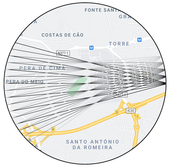 Simplified schematic representation of the first five fans acquired by the drone over the circular trajectory. The drone stops at the vertex of each fan, represented on the right. These points correspond to point A in the explanation of the two measurement moments in Section 2.2. Each line in the drawing represents a ray within a fan, i.e., a direction, in which a projection is taken. The “exit points” of each ray from the ROI correspond to point B, and are represented on the left. In the second measurement moment, the drone moves to each of these points and takes another spectrum in the same direction as the ray itself. Here, both fans and rays are separated by an angular interval of 5 degrees, and there are only 3 rays within each fan, for graphical simplicity. Both values are customisable at runtime. The map, included for example purposes, was retrieved from Google Maps in 2019 ©Google.