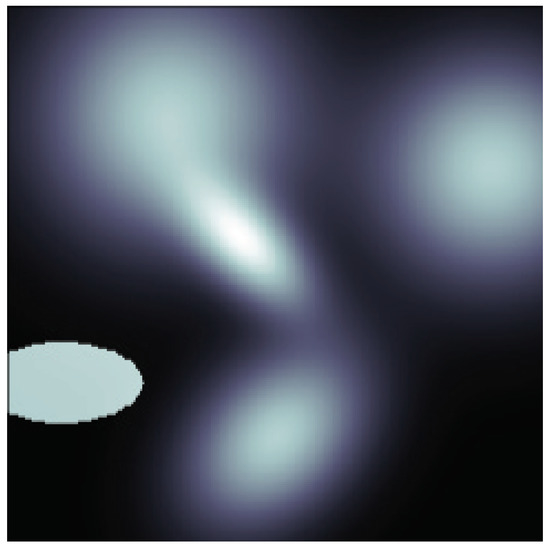 In medicine, a phantom is a model that emulates certain properties of human or animal tissue. Researchers use these models to evaluate therapeutic or diagnostic methods. In the imaging field, phantoms are known matrices with a given size that were designed to mimic the types of bodies that are to be reconstructed with the technique or algorithm being tested. Most phantoms described in the literature were constructed specifically for medical imaging, since this is clearly the most prominent application field for tomographic methods. Computed Tomography phantoms, for instance, intend to mimic the X-ray absorption of the human body, or of part of the human body. Since the distribution of gases in the atmosphere is entirely different from biological tissue’s, these phantoms are not adequate for TomoSim. This implied the design of a new phantom, based on the idea that a two-dimensional (in this case) Gaussian peak is more appropriate to describe the smoother nature of the distribution of a gas than a series of sharply defined ellipses [31]. The new phantom, designed with TomoPhantom [32], is comprised of 5 bivariate Gaussian profiles, depicting a static gas mixture, and an ellipse near one corner of the image, which serves as a reference point. This new spectral phantom can be seen in Figure 4, and a descriptive summary is provided in Table 1.