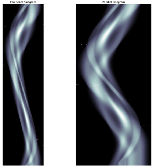 TomoSim then performs a resorting operation on the sinogram, in order to transform the fan beam projections into parallel projections, greatly simplifying image reconstruction. Since the angular interval between the fans and the rays within the fans is the same (), resorting is greatly simplified [9]. After discretisation and the necessary resorting steps are taken, the software reconstructs the images with three different algorithms—MLEM, FBP and SART.