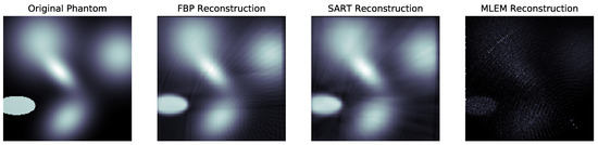 The three methods were also evaluated as to how they perform computationally, by measuring the time it took to produce the images in Figure 6 using a Paperspace P4000 cloud computing instance. In this regard, the fastest method was FBP, which took around 3 s to reconstruct. The second was MLEM, with around 50 s for 1000 iterations, and finally came SART, with 1 min and 50 s for 1 iteration. One relevant observation comes from the fact that MLEM was significantly faster than SART, even taking into account the difference in optimisation, which was not an expected result and may indicate some reconstruction enhancing technique on SART’s side, as the literature seems to indicate that this technique is faster than MLEM [15].