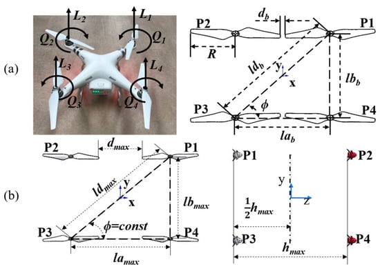 Illustration of a quadrotor copter, propeller configuration, and morphological parameters. (a) Quadrotor copter of DJI phantom 3 advanced with definitions of lift force (), torques (), and a basic propeller configuration with = 0.12 m, ≈ 0.252 m, ≈ 0.243 m, = 0.35 m, ≈ 0.012 m, ≈ 44° at height difference, = 0. (b) The maximum (optimal) propeller configuration with ≈ 0.425 m, ≈ 0.410 m, = 0.59 m, ≈ 0.185 m, ≈ 44°at height difference, = 0.24 m.